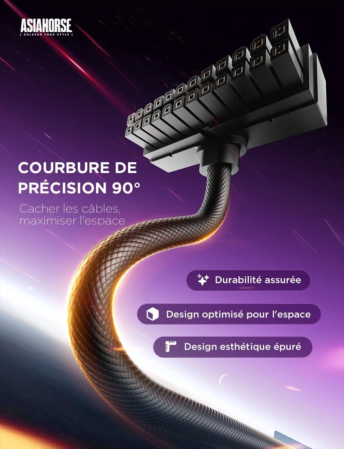 Le câble d’extension AsiaHorse Hydrus 24 Pin se positionne comme une solution dédiée aux configurations PC haut de gamme, où la gestion des câbles et la modularité deviennent des critères essentiels. Conçu pour répondre aux besoins des utilisateurs exigeants, ce modèle se distingue par sa conception technique et ses fonctionnalités adaptées aux alimentations ATX modernes.