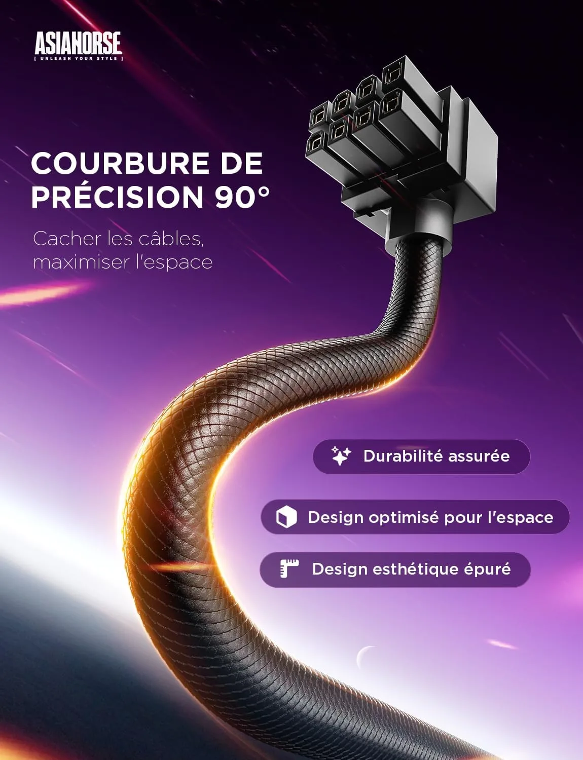 - AsiaHorse Hydrus : Idéal pour les passionnés exigeants, les overclockers ou les utilisateurs de cartes mères haut de gamme (ex : ASUS ROG, MSI MEG). Son gainage modulaire et ses connecteurs robustes en font un choix premium pour les builds nécessitant une installation soignée et une durée de vie prolongée.