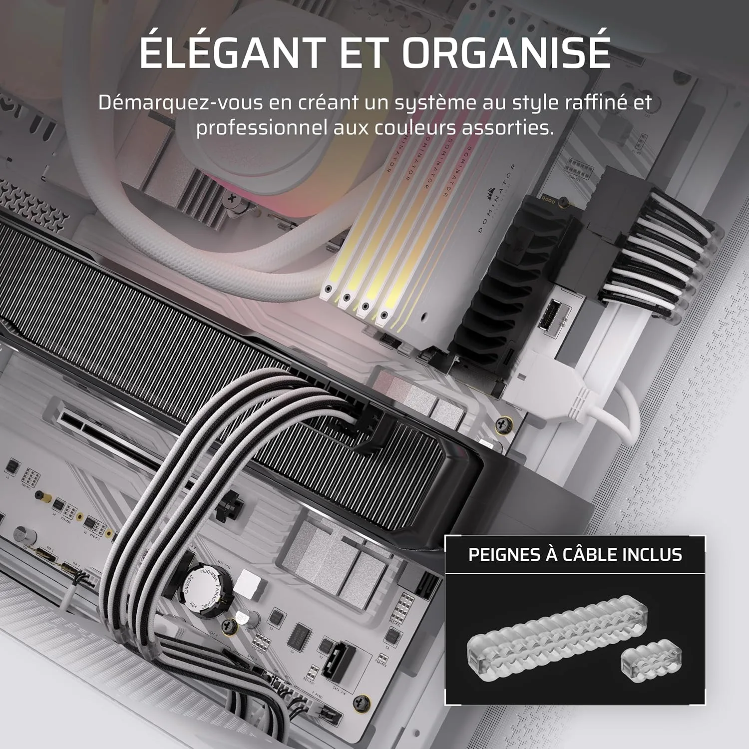 Les câbles standard, souvent mal isolés ou de mauvaise qualité, peuvent générer des pertes d’énergie sous forme de chaleur, réduisant l’efficacité de l’alimentation. Les kits haut de gamme, comme celui de Corsair, intègrent des gaines individuelles en maille triple couche et des peignes à câble profil bas, conçus pour minimiser les interférences électromagnétiques et améliorer le flux d’air dans le boîtier. Résultat : une meilleure stabilité des voltages, une dissipation thermique réduite et une durée de vie prolongée pour la PSU et les composants connectés.