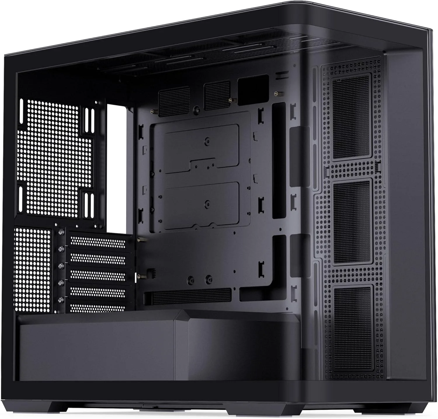 Le boîtier Jonsbo D300 se distingue par une caractéristique technique rare dans le milieu des mid-towers : son panneau latéral en verre trempé coudé à 270 degrés. Cette conception audacieuse, loin des standards rectilignes des boîtiers traditionnels, répond à des enjeux esthétiques et fonctionnels précis, tout en posant des défis en matière de fabrication.