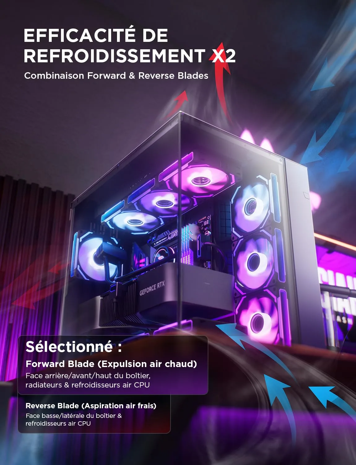 - Orientation du flux d’air : Pour les ventilateurs en 120MM, l’orientation matière (pousser ou tirer l’air) dépend de votre configuration. En pull (extraction), ils sont souvent plus efficaces pour évacuer la chaleur des composants comme le GPU.