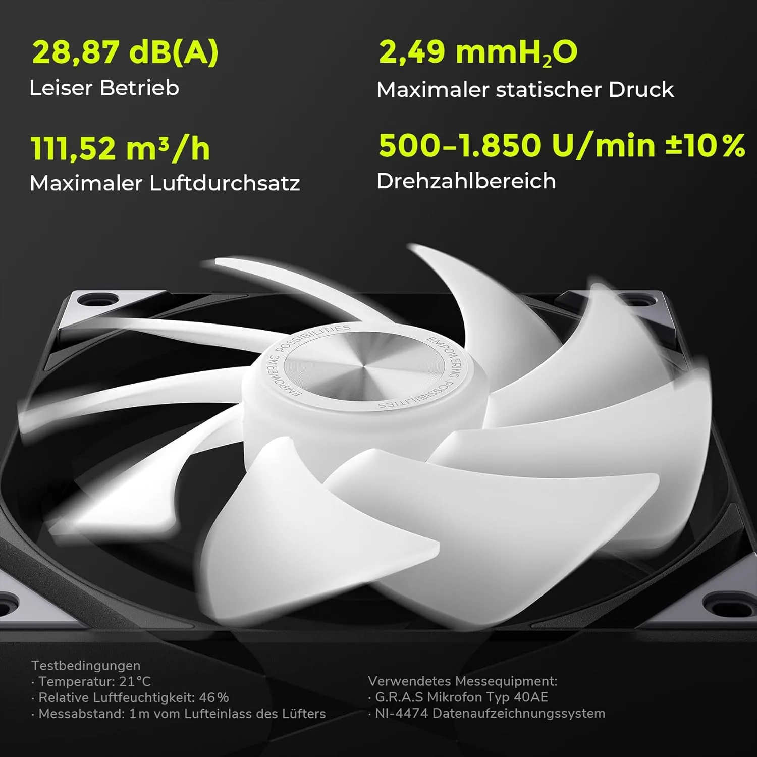 - Performances adaptées aux GPU haut de gamme : Avec un débit d’air de 60,5 m³/h et une pression statique de 2,6 mmH₂O, il excelle dans le refroidissement des cartes graphiques récentes, rivalisant avec des modèles comme les Corsair iCUE QL120.