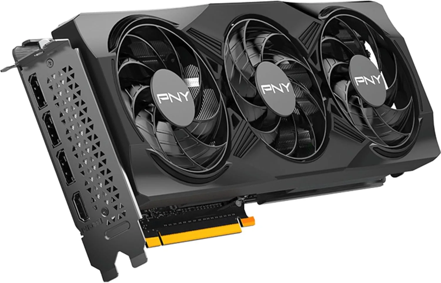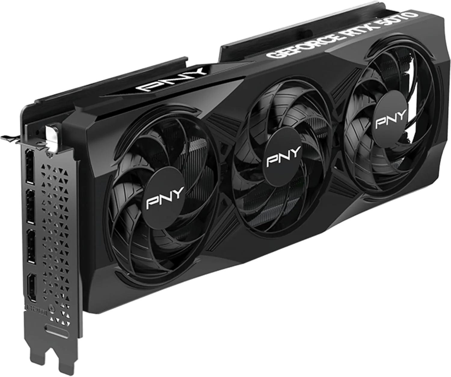 PNY a opté pour un système de refroidissement Triple Fan avec des ventilateurs de 90 mm et un dissipateur thermique en cuivre renforcé. Contrairement à certaines cartes haut de gamme qui privilégient des solutions plus silencieuses, ce design vise à maintenir des températures stables sous charge intensive, avec des niveaux de bruit modérés (environ 45 dB en charge, selon les tests). La carte mesure 285 mm de long, ce qui peut poser des contraintes dans les boîtiers compacts, mais reste compatible avec la majorité des configurations.