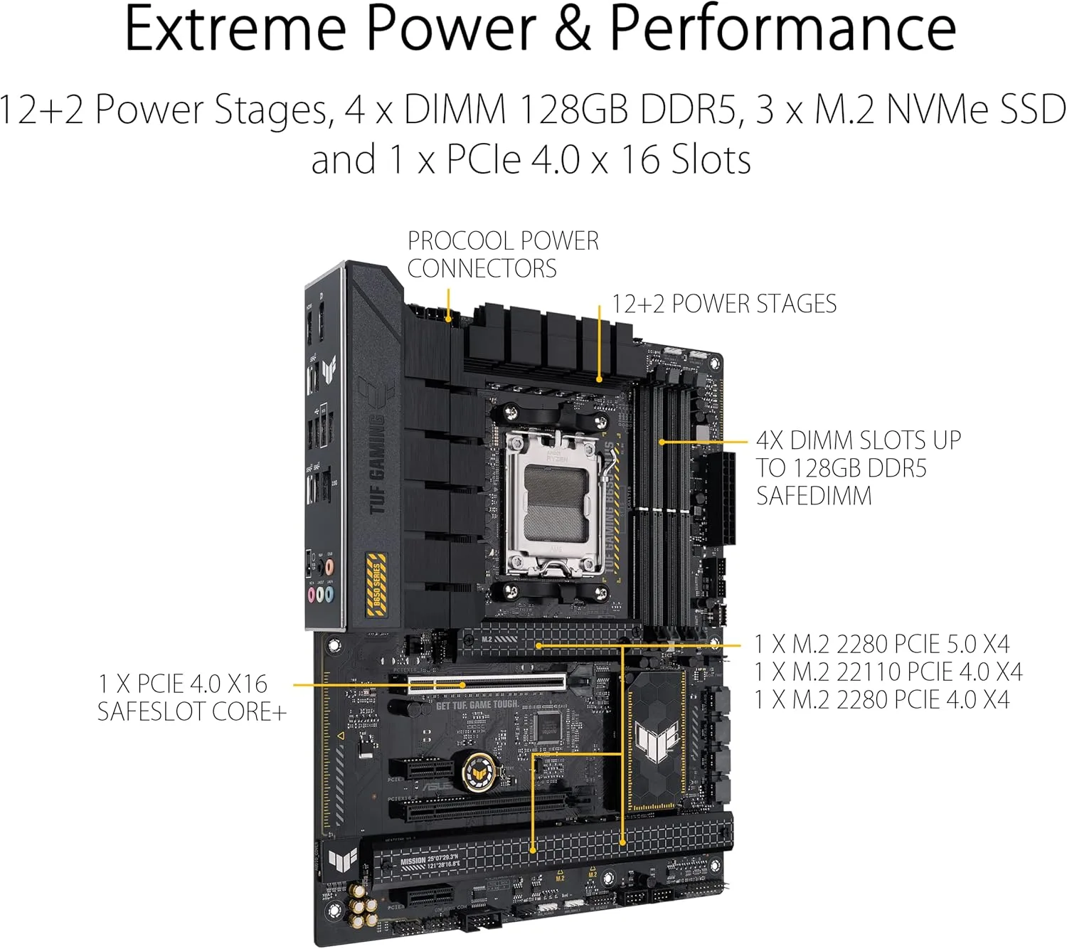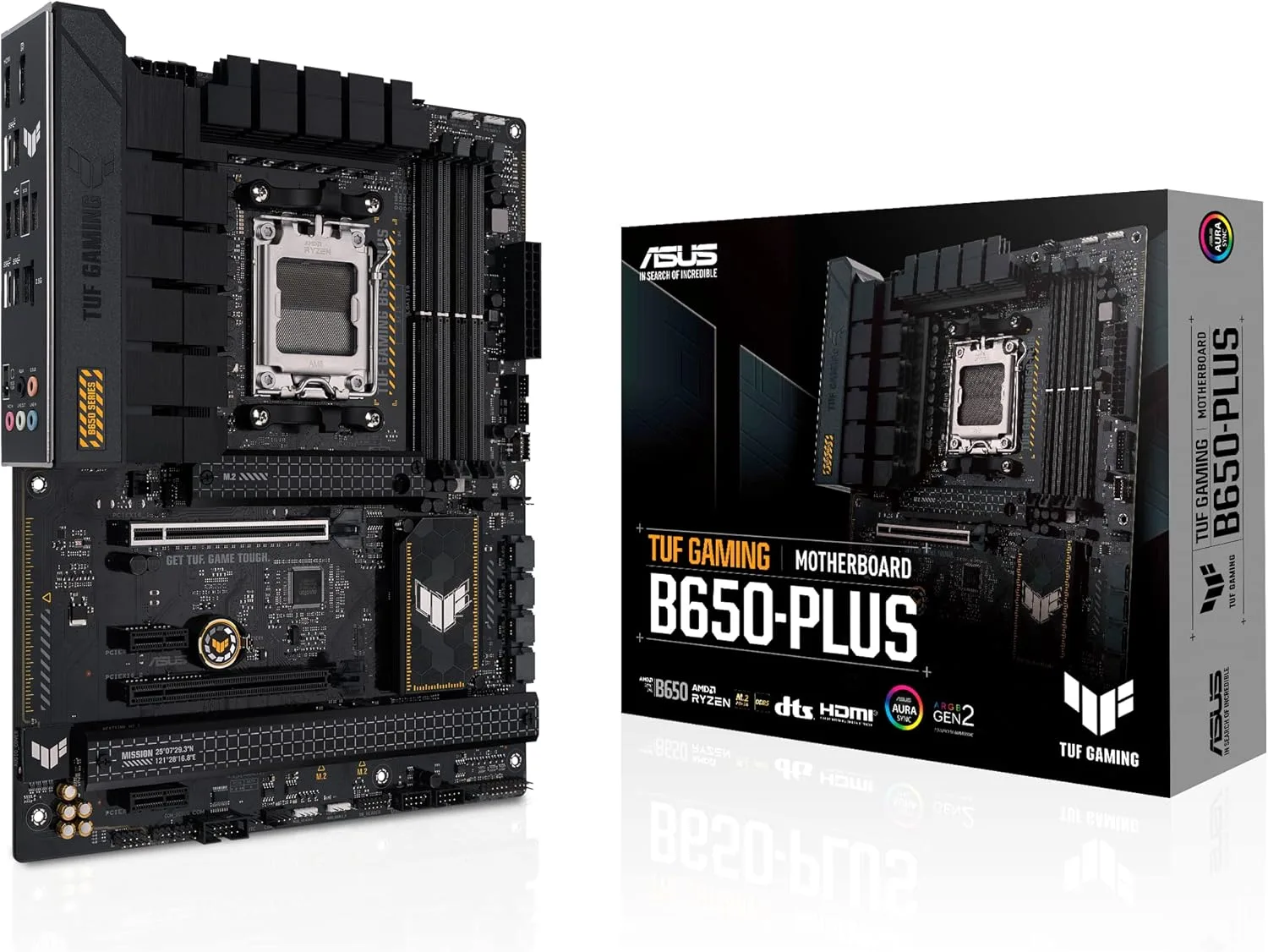 La carte mère ASUS TUF GAMING B650-PLUS adopte le socket AM5, une plateforme conçue pour assurer une compatibilité optimale avec les processeurs Ryzen 7000 d’AMD, mais aussi avec les futures générations de CPU basées sur cette architecture. Cette compatibilité inclut notamment les Ryzen 8000 (comme le Ryzen 9 8950X3D) et les modèles à venir, sous réserve de leur adoption du socket AM5. À noter que cette plateforme supporte également les APU Ryzen 7040G (comme le Ryzen 7 7800GX4), offrant une flexibilité accrue pour les configurations intégrant GPU et CPU.