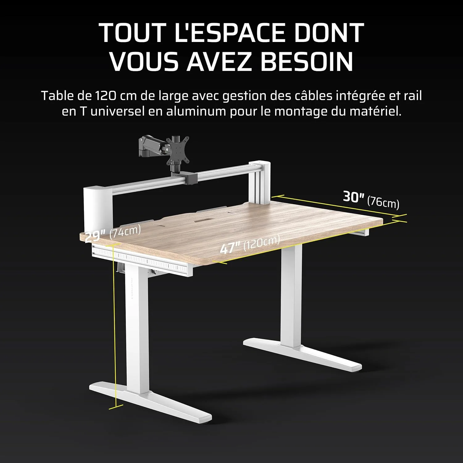 Intégrez le bras d’écran inclus en le fixant sur le côté droit du plateau. Son design articulé (avec inclinaison et rotation) supporte jusqu’à 10 kg, idéal pour les écrans gaming ou professionnels. Pensez à ajuster la hauteur du bras pour éviter les tensions cervicales, un critère souvent négligé dans les configurations bureautiques classiques.