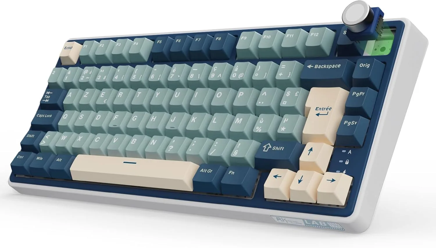 L’un des points forts du R75 réside dans son knob rotatif intégré, une fonctionnalité inspirée des claviers professionnels comme le Keychron Q-series. Ce bouton programmable permet de réorganiser les couches QMK/Via à la volée, une innovation pratique pour les utilisateurs de logiciels comme OBS Studio ou Photoshop. Les PBT keycaps (en version AZERTY française) apportent une durabilité accrue et une résistance aux rayures, bien que leur finition mate puisse sembler moins premium que des modèles ABC ou POM.