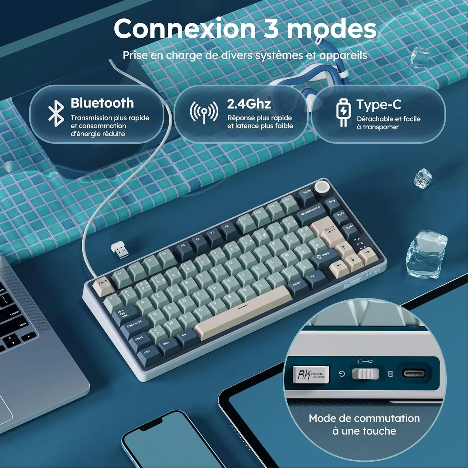 Le RK ROYAL KLUDGE R75 se distingue par une approche innovante de la connectivité sans fil, combinée à une fonctionnalité rare dans les claviers gaming : l’intégration d’un knob mécanique dédié. Cette dualité technologique vise à répondre aux besoins des joueurs exigeants, tout en offrant une flexibilité inédite pour les configurations personnalisées.