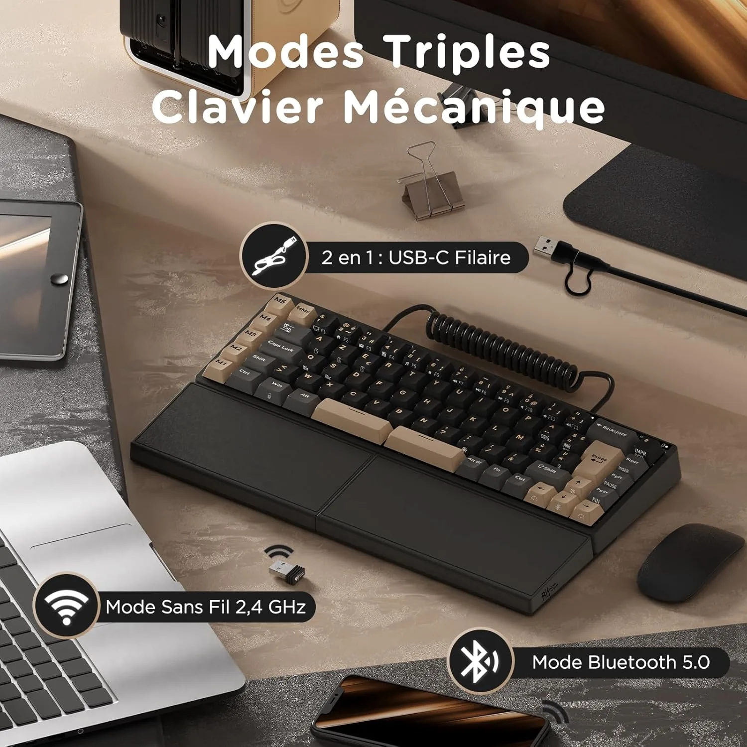 • Compatibilité Bluetooth 5.0, 2.4G sans fil et filaire (USB-C), offrant une polyvalence rare dans les claviers compacts.