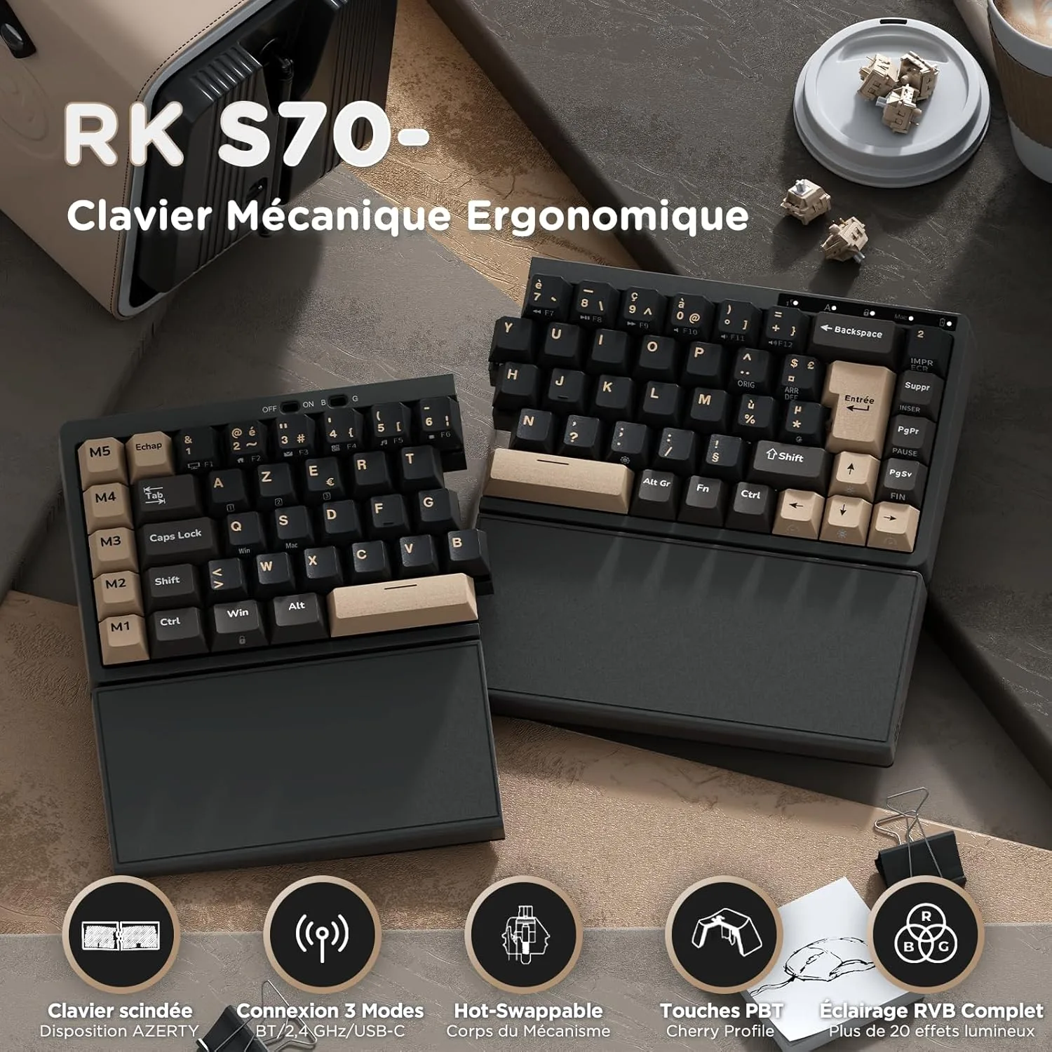 • Structure split keyboard (60% compact) avec repose-poignets intégré, réduisant la fatigue sur de longues sessions.
