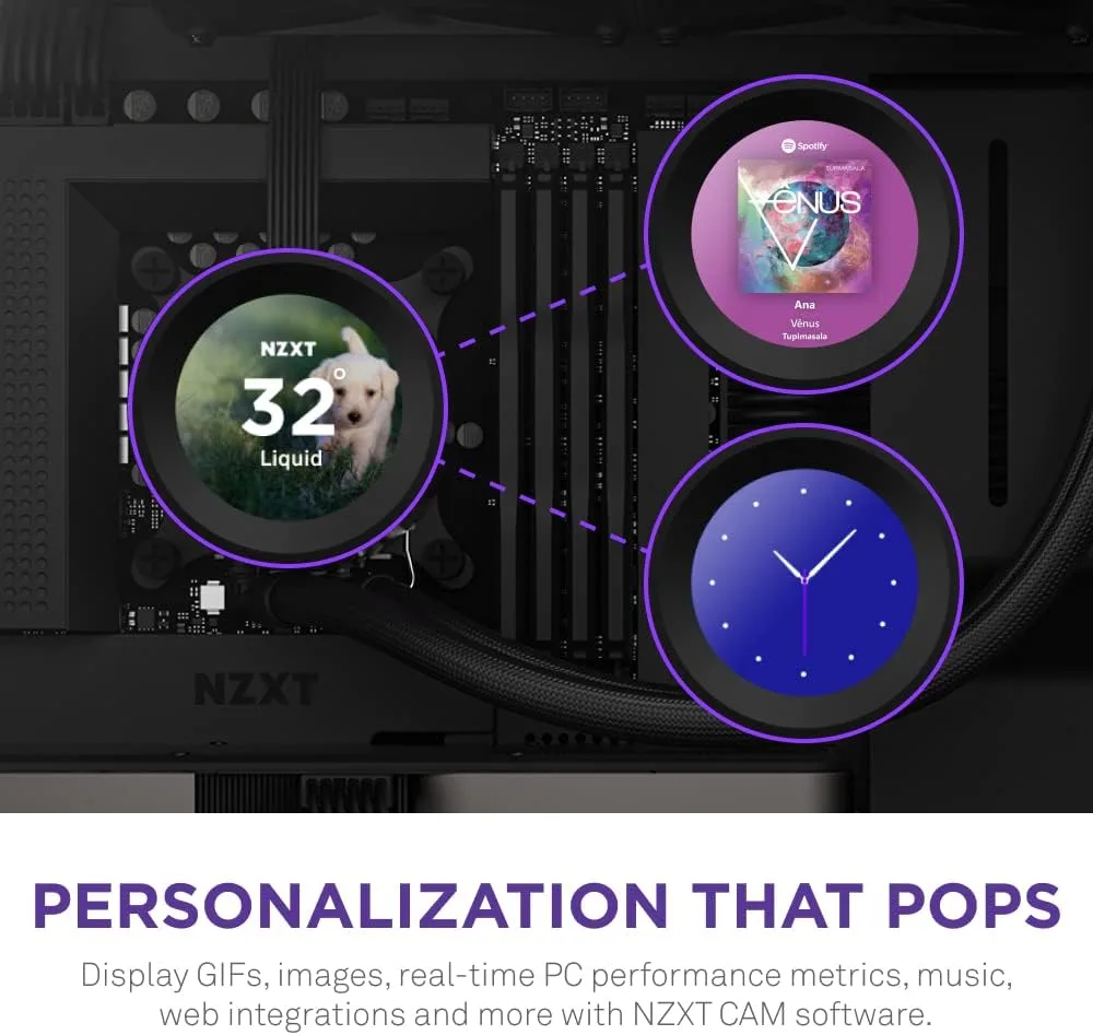L’une des caractéristiques les plus distinctives du Kraken Elite 280 réside dans son écran LCD de 6 cm, intégré directement sur le radiateur. Contrairement aux modèles basiques, cet écran n’est pas limité à des informations basiques comme la température : il permet d’afficher des images personnalisées, des mesures de performance en temps réel (température CPU, vitesse des ventilateurs, débit de la pompe), ou même des notifications système. Cette fonctionnalité, rare dans les refroidisseurs liquides grand public, en fait un outil à la fois pratique et esthétique, idéal pour les utilisateurs souhaitant surveiller leur système sans recourir à des logiciels tiers.