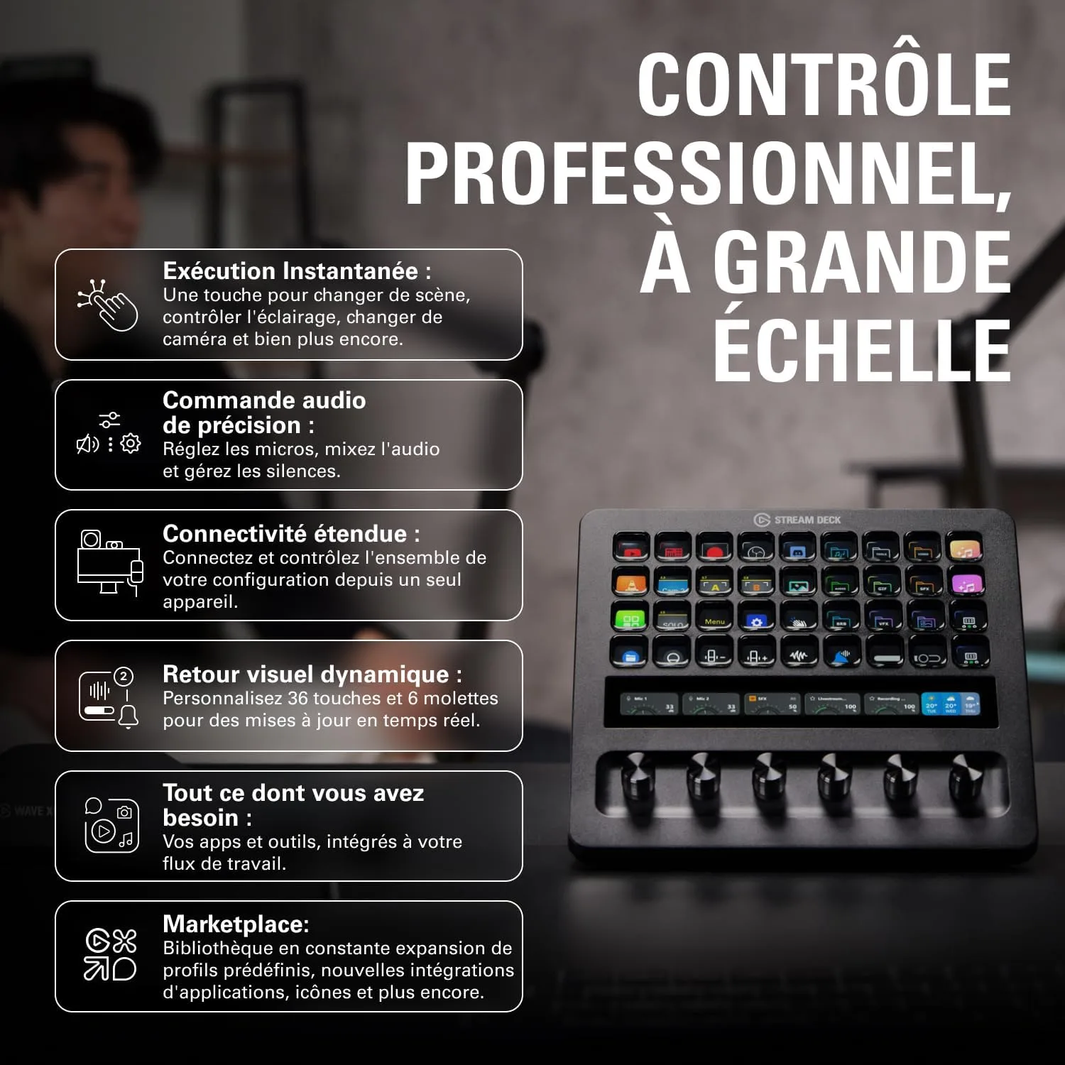 | Logiciel associé | Elgato Stream Deck Software (avec support pour OBS, Twitch, Adobe Premiere, etc.) |